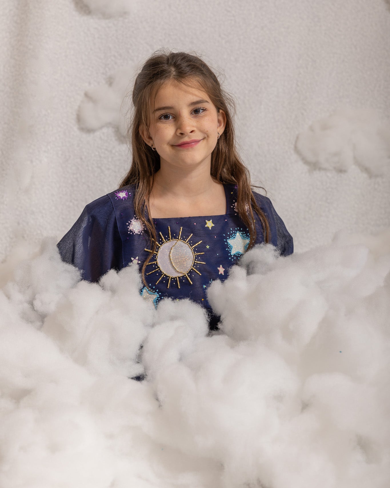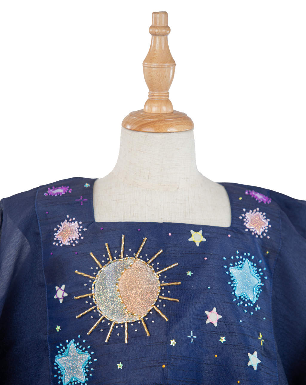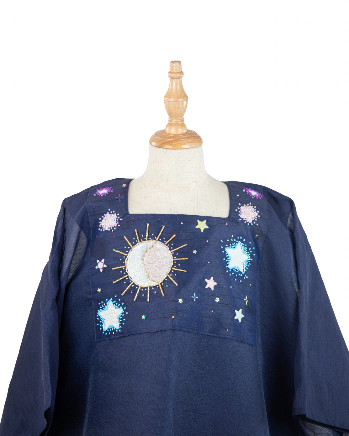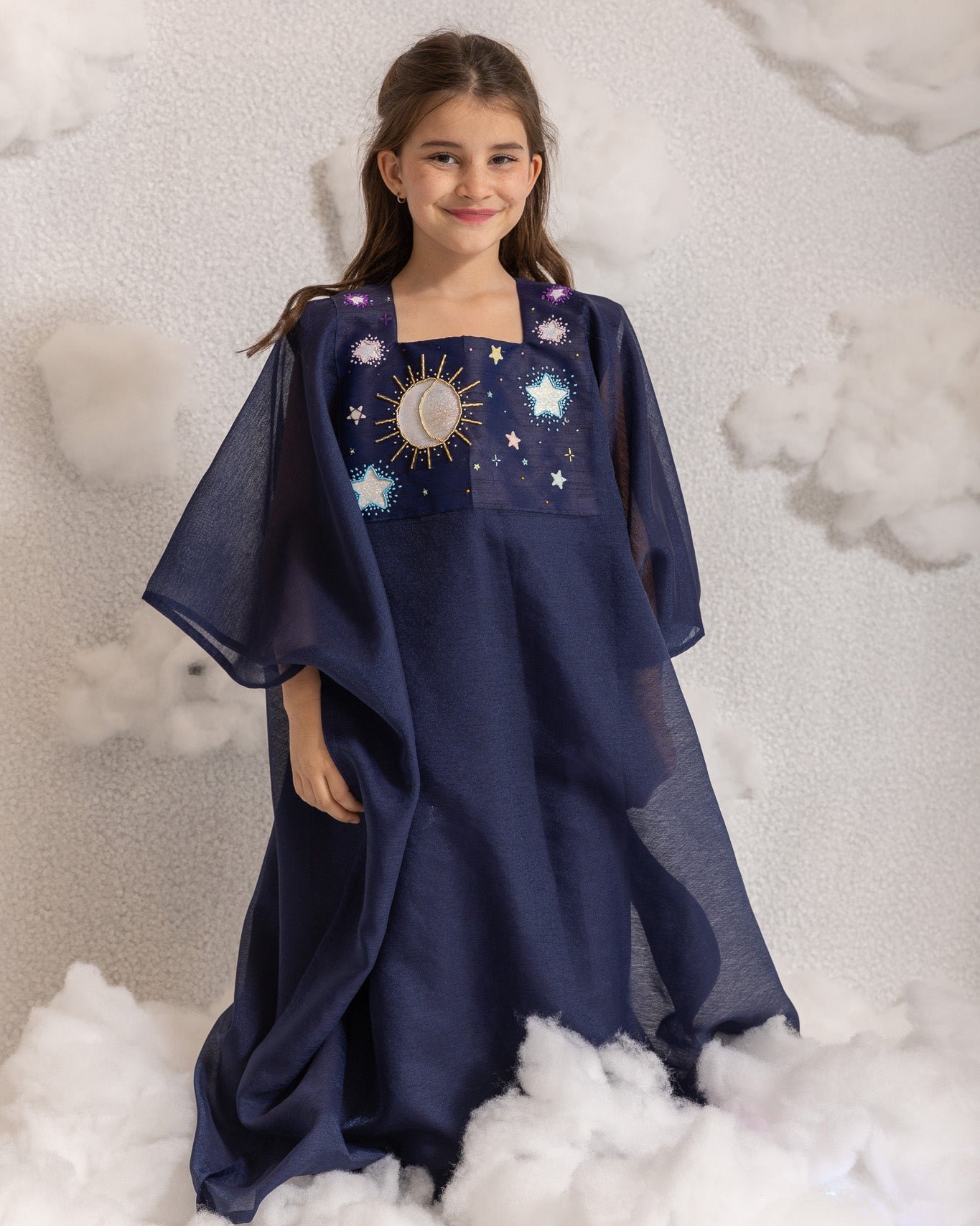 THIS JALABIYA CHANGES COLORS WHEN EXPOSED TO SUNLIGHT. THE STAR, SUN, AND MOON TRANSFORM FOR A SHIMMERY WHITE TO DIFFERENT COLORS JUST LIKE MAGIC! IT ALSO HAS STARS THAT GLOW IN THE DARK.